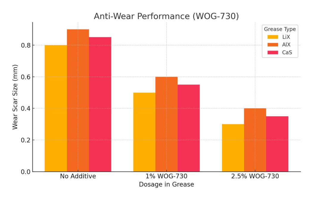 Result: Significant reduction in wear scar size compared to greases without WOG-730.