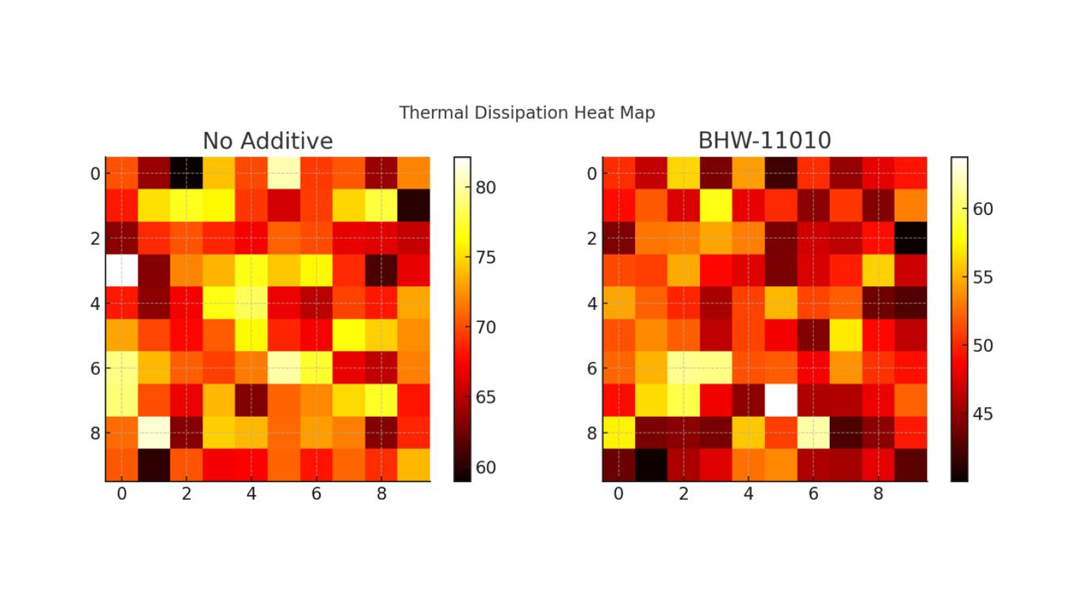 Results : BHW-11010 enhances thermal conductivity in water-based systems, demonstrating lower peak temperatures and more uniform heat distribution.